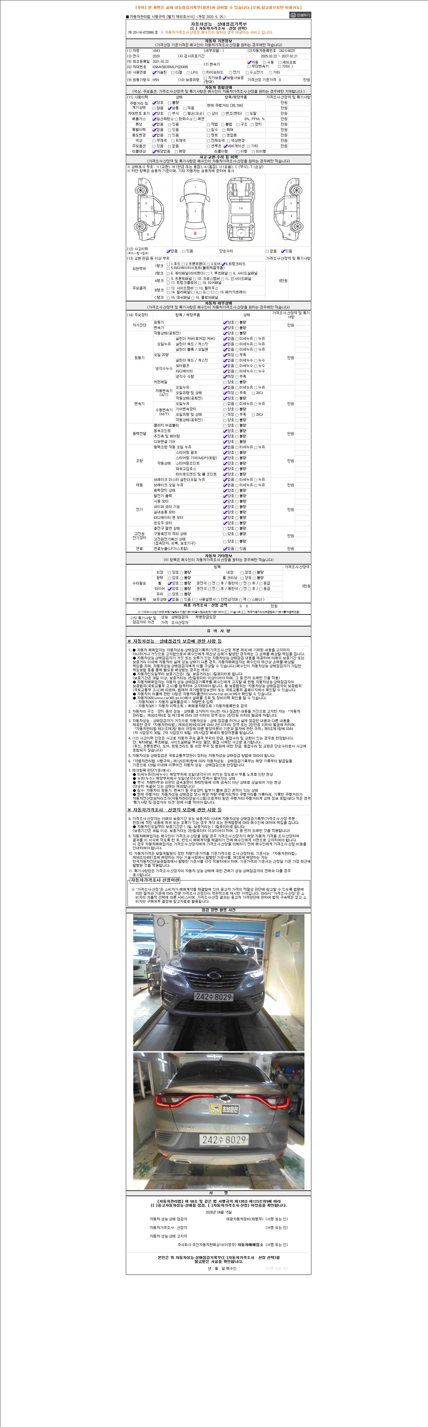 자동차관리법 시행규칙 제120조의 규정에 따라 별지 제 82호서식 《중고자동차 성능, 상태점검 기록부》를 발행한 성능, 상태점검자 및 매매자는 아래의 보증기간 또는 보증거리 이내의 중고자동차, 성능점검 기록부에 기재된 내용과 자동차의 실제 성능, 상태가 다른 경우 계약 또는 관계법령에 따라 매수인에 대하여 책임을 집니다.