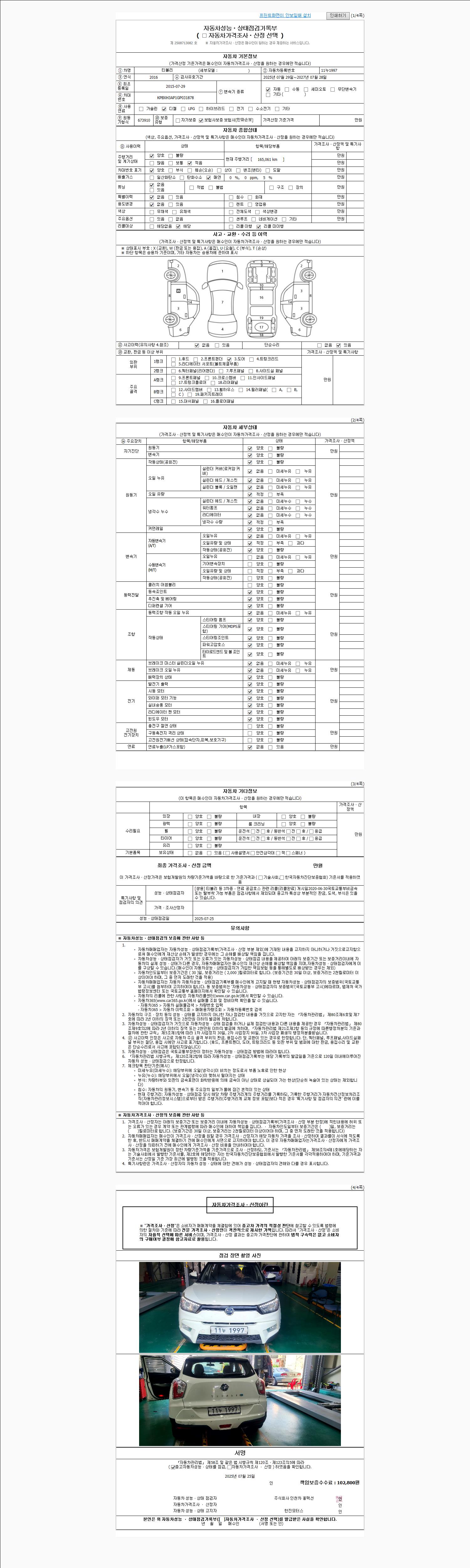 | 주행거리 | 165,061 km | 차량번호 | 11누1997 | 사고유무 | 성능기록부 참조 | 제시번호 | 제 2025040444 호 |