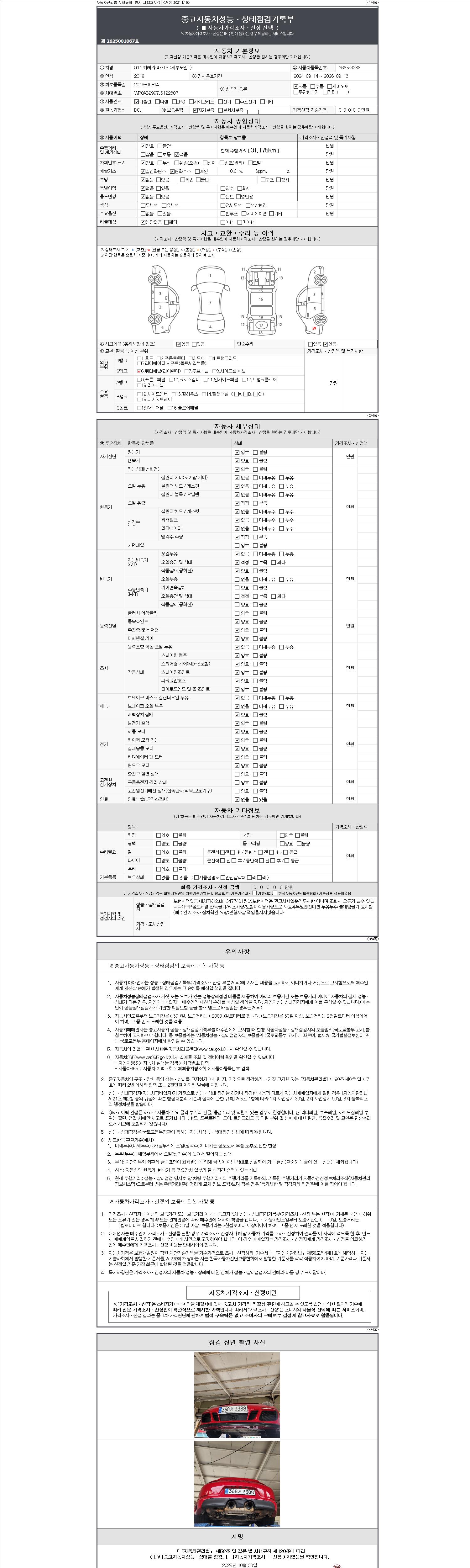 | 주행거리 | 31,175 km | 차량번호 | 368서3388 | 사고유무 | 성능기록부 참조 | 제시번호 | 제 2147483647 호 |