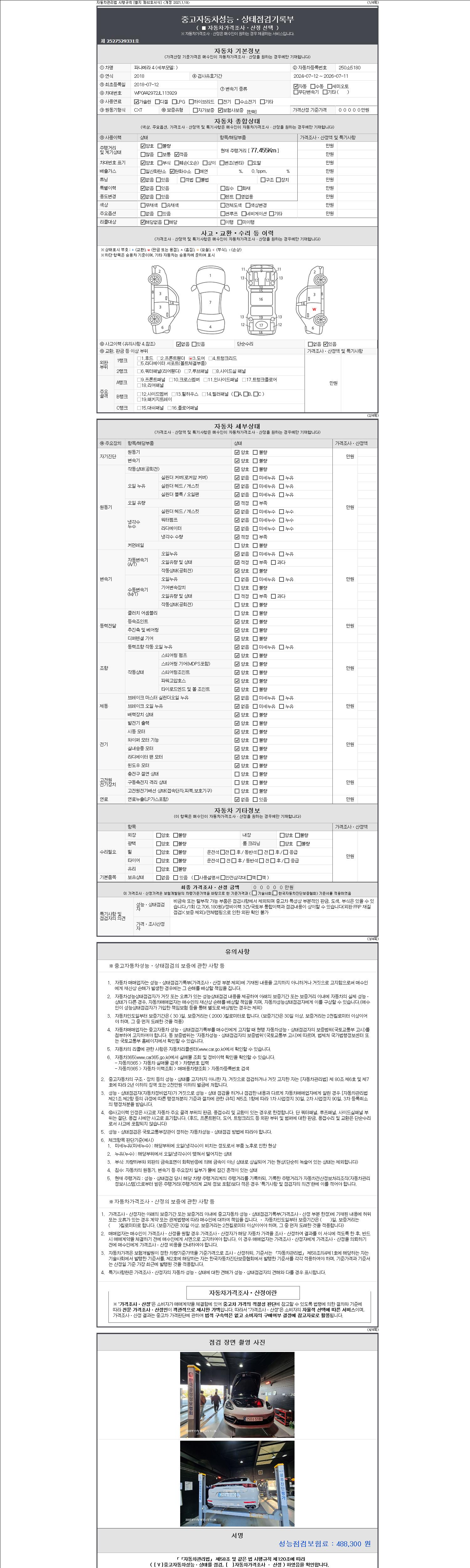 | 주행거리 | 77,436 km | 차량번호 | 250소5180 | 사고유무 | 성능기록부 참조 | 제시번호 | 제 2147483647 호 |