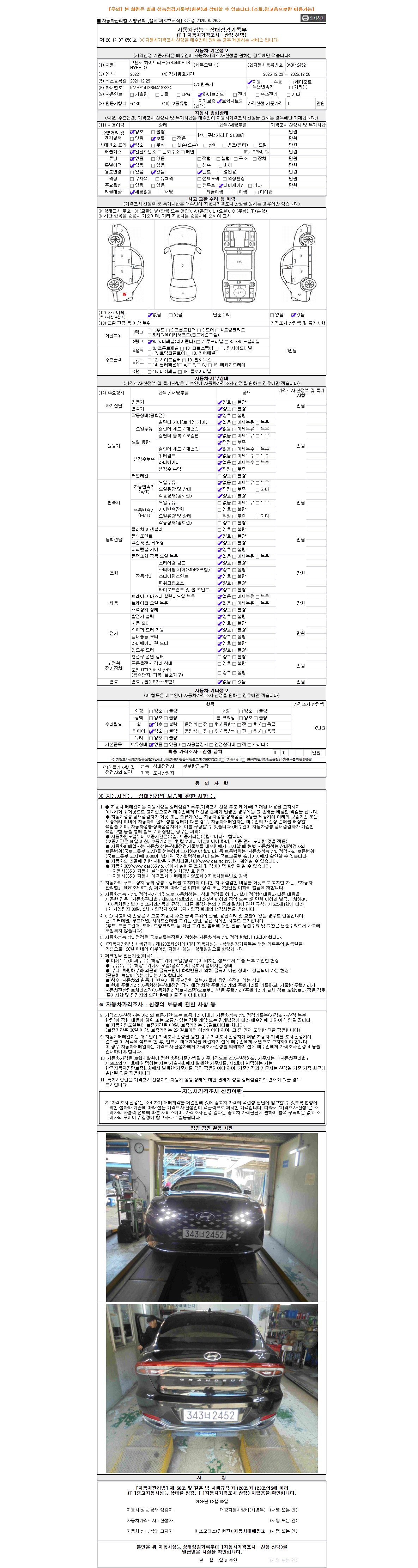 | 주행거리 | 121,791 km | 차량번호 | 343너2452 | 사고유무 | 성능기록부 참조 | 제시번호 | 제 2026014110 호 |