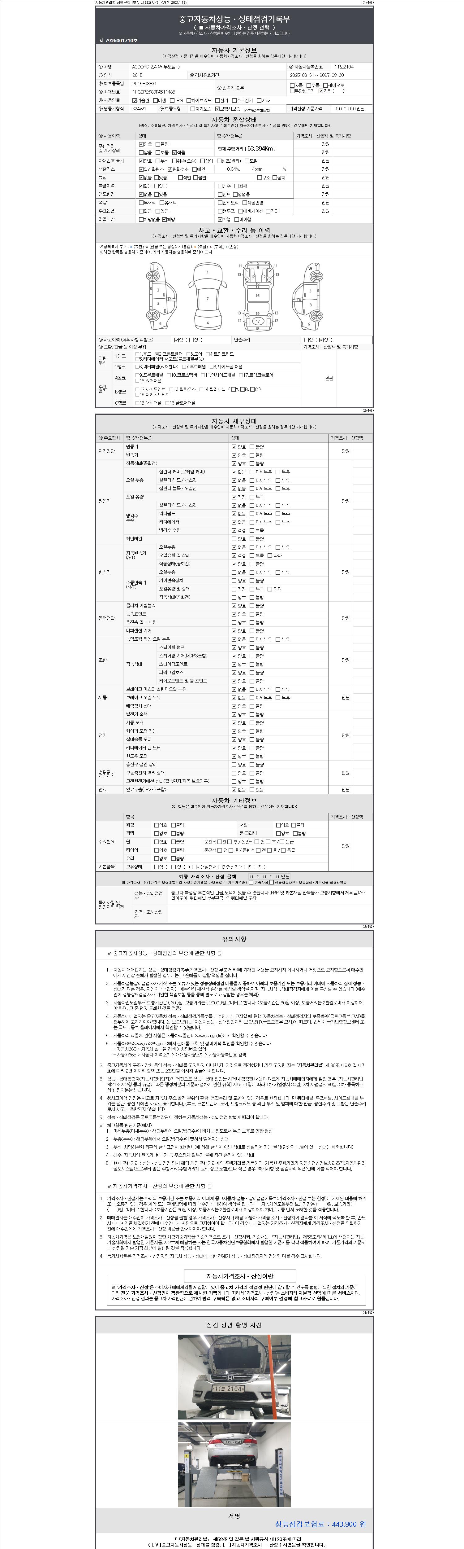자동차관리법 시행규칙 제120조의 규정에 따라 별지 제 82호서식 《중고자동차 성능, 상태점검 기록부》를 발행한 성능, 상태점검자 및 매매자는 아래의 보증기간 또는 보증거리 이내의 중고자동차, 성능점검 기록부에 기재된 내용과 자동차의 실제 성능, 상태가 다른 경우 계약 또는 관계법령에 따라 매수인에 대하여 책임을 집니다.
