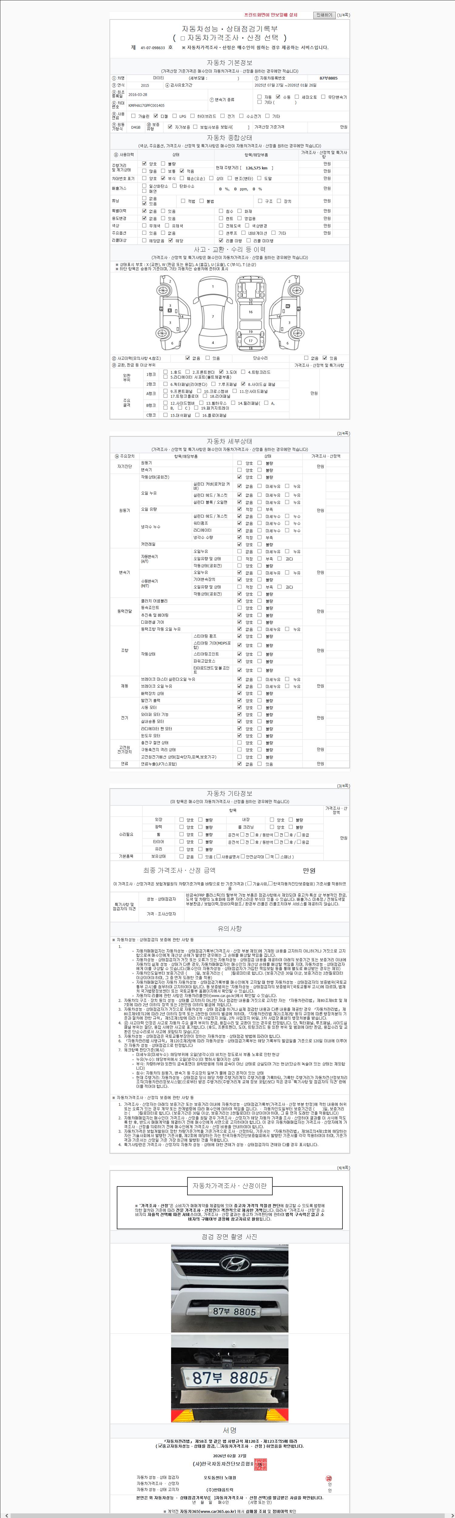| 주행거리 | 126,502 km | 차량번호 | 87부8805 | 사고유무 | 성능기록부 참조 | 제시번호 | 제 2147483647 호 |
