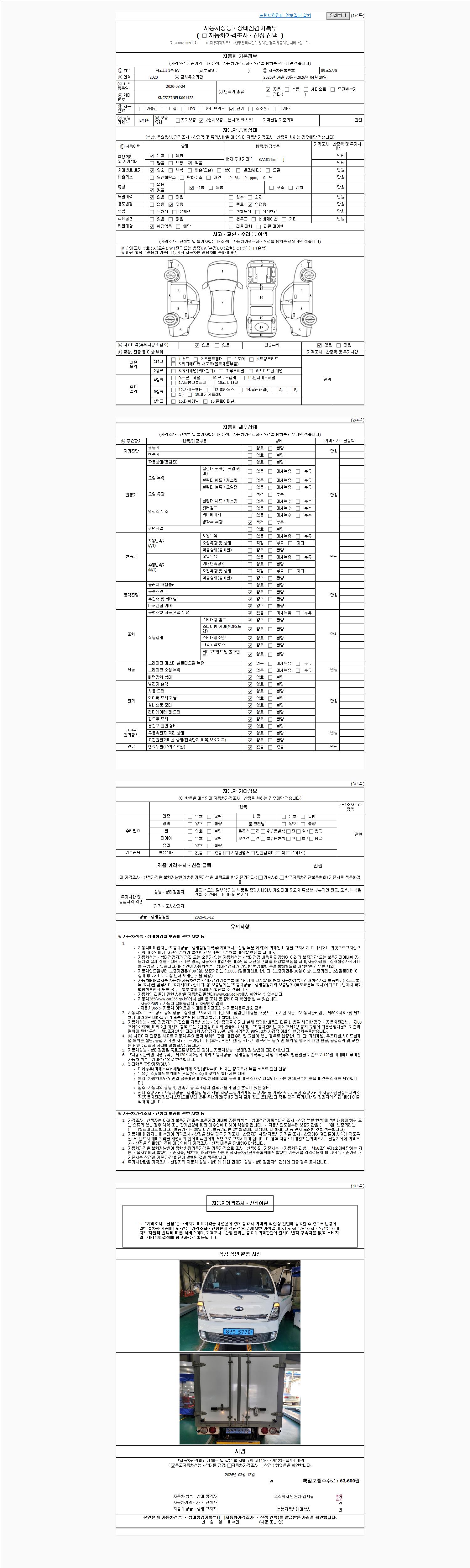 | 주행거리 | 87,101 km | 차량번호 | 89오5778 | 사고유무 | 성능기록부 참조 | 제시번호 | 제 2026013081 호 |