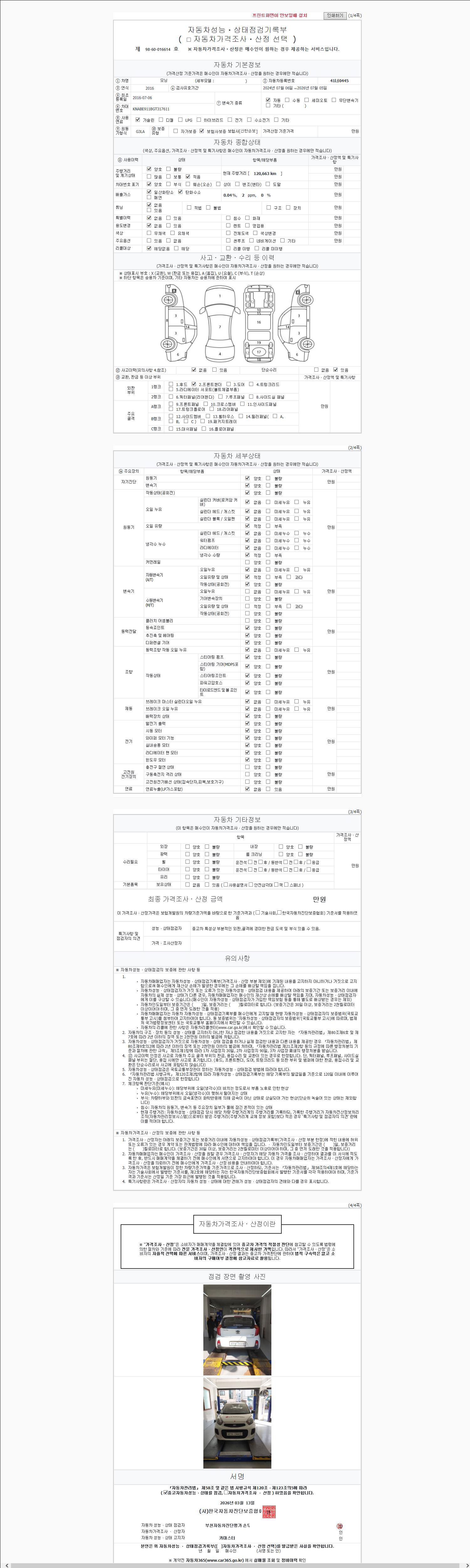 | 주행거리 | 120,663 km | 차량번호 | 41너0445 | 사고유무 | 성능기록부 참조 | 제시번호 | 제 2026011856 호 |