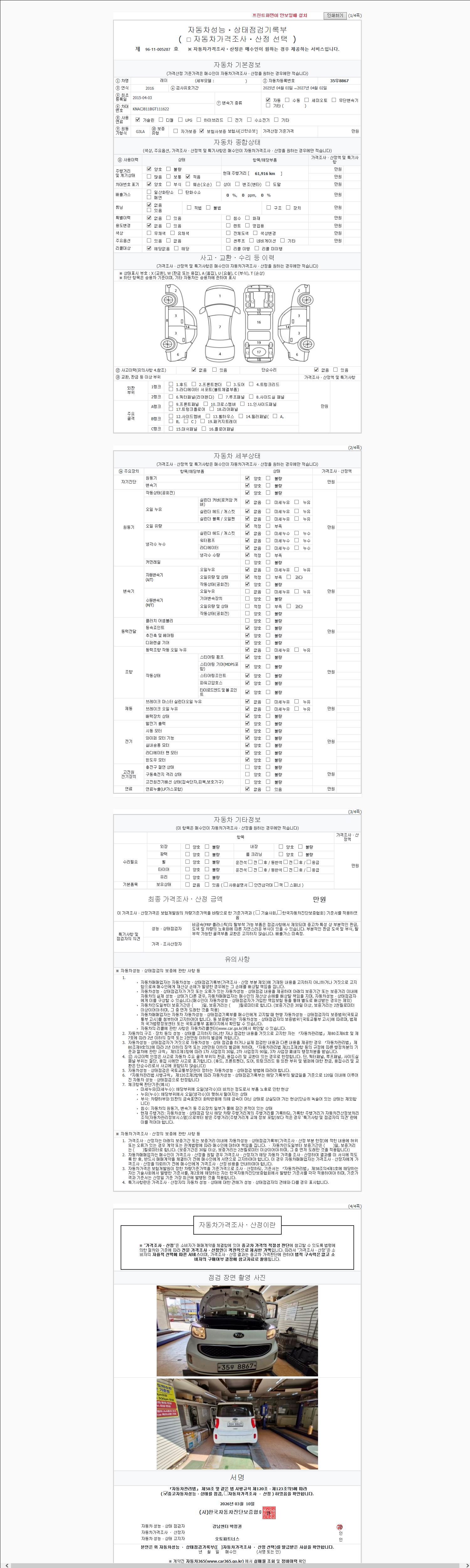 | 주행거리 | 61,916 km | 차량번호 | 35우8867 | 사고유무 | 성능기록부 참조 | 제시번호 | 제 2026030528 호 |
