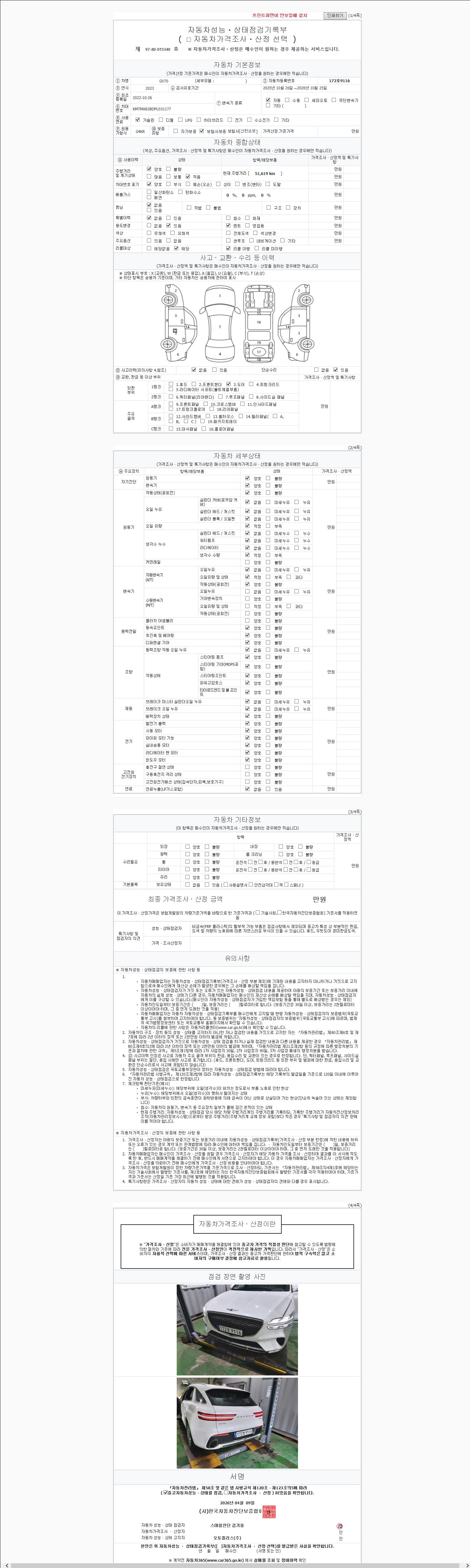 | 주행거리 | 51,619 km | 차량번호 | 172호9116 | 사고유무 | 성능기록부 참조 | 제시번호 | 제 2026011657 호 |